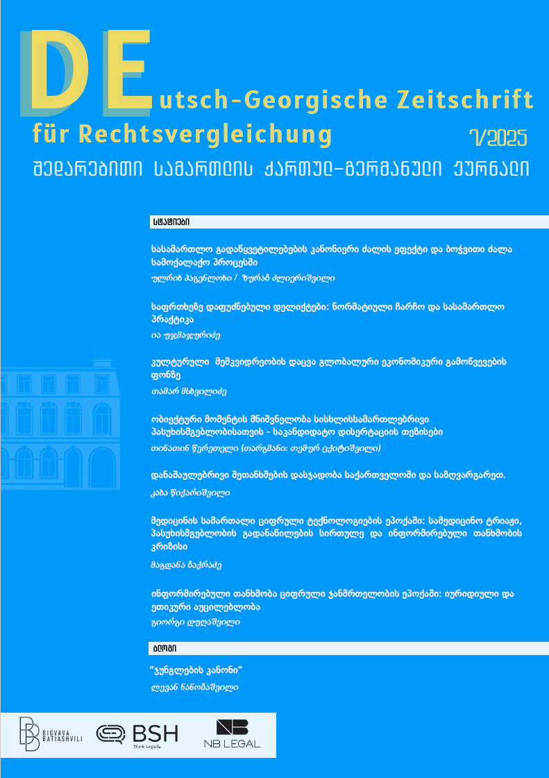 Die „Deutsch-georgische Zeitschrift für Rechtsvergleichung“ ist ein Forum für Lehre und Wissenschaft, in dem neben traditionellen Abteilungen spezielle Rubriken der Falllösung, den Grundfällen und den Rechtsprechungsanmerkungen gewidmet sind. Als Autor darf jeder deutsche oder georgische Jurist dazu beitragen, der über die rechtsvergleichende Thematik arbeitet. Die Zeitschrift wird viermal pro Jahr sowohl auf Deutsch als auch auf Georgisch erscheinen.